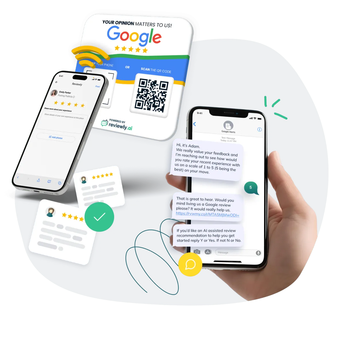 Collect instant feedback with QR codes, NFC tags, or Review Plates—so customers can leave reviews on the spot. Motivate your team with a real-time leaderboard tracking who’s driving the most reviews. Plus, with our SMS Feedback Loop, send review requests via one-off texts, bulk uploads, or straight from your CRM. Our AI even drafts responses—so every review shines.